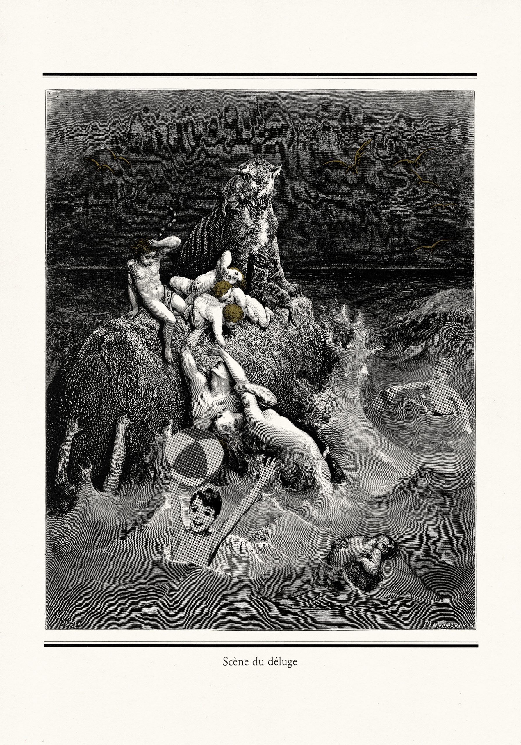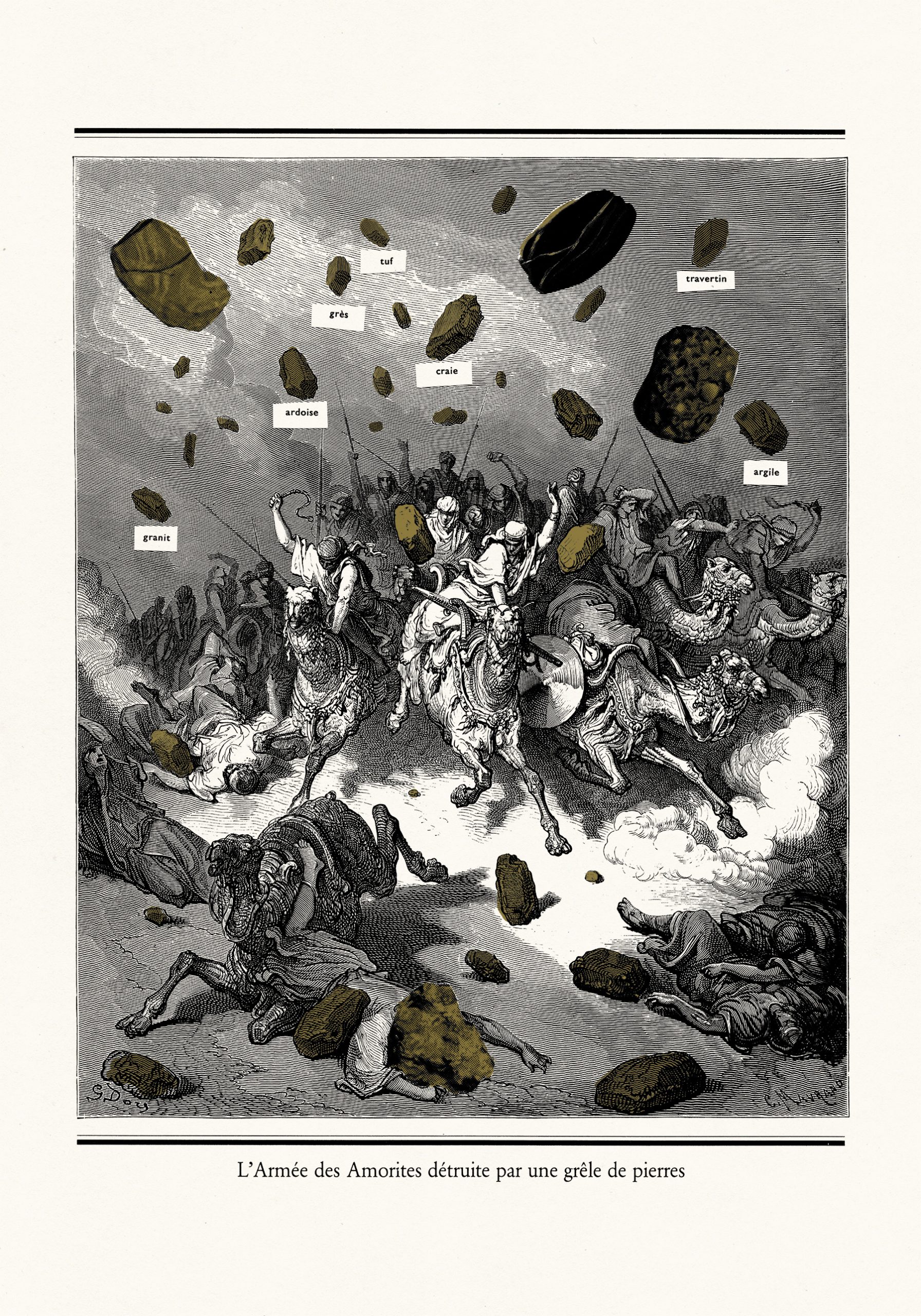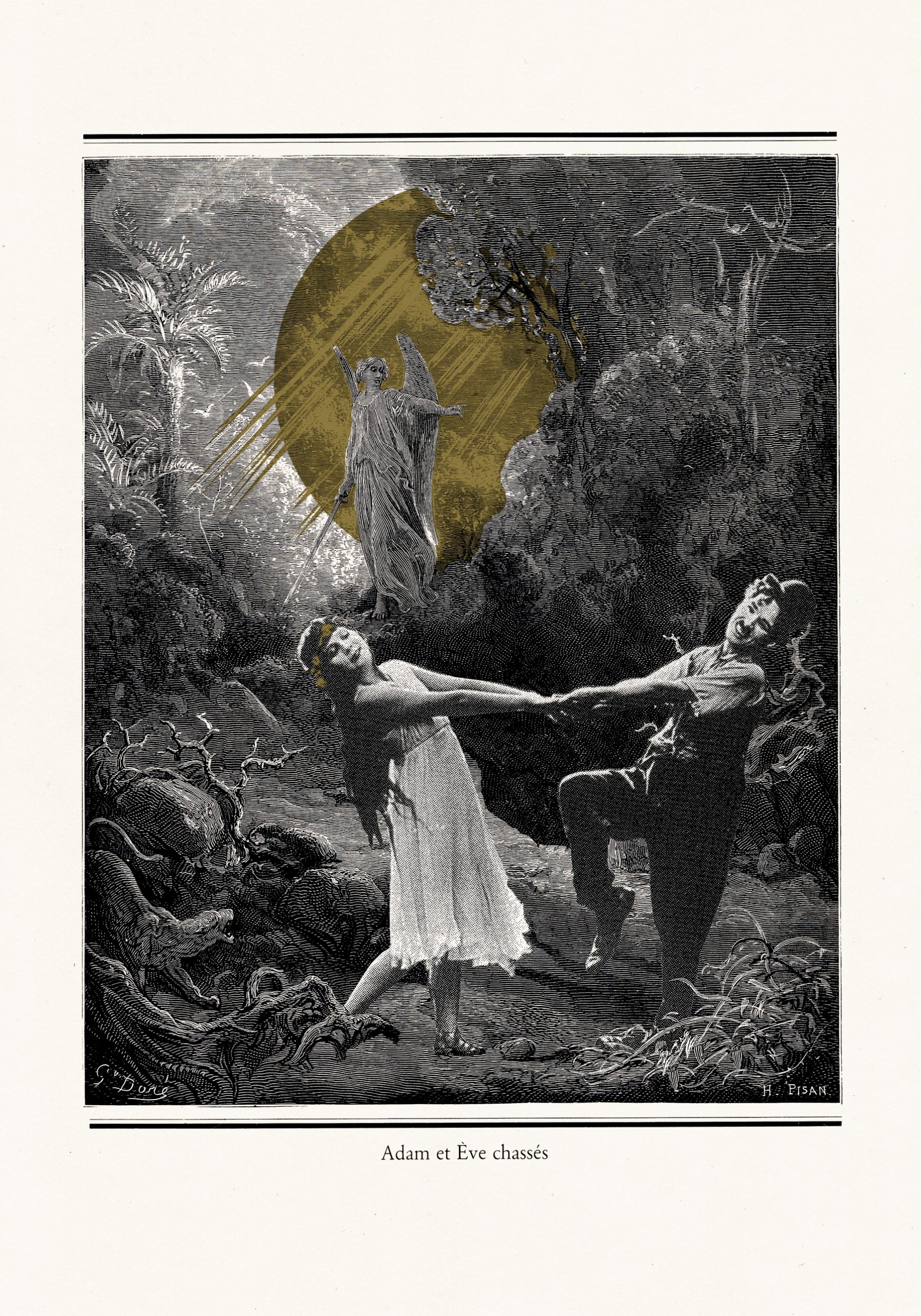 Cette série marque une évolution dans ma pratique du collage et une sorte de retour par procuration à la gravure, base de ma formation artistique. Les images d’origine proviennent de la Bible illustrée de Gustave Doré, dont sont conservées les légendes. Si l’objet final est une édition en sérigraphie imprimé en noir et doré, les images démarrent par un collage prototype sur papier, qui est ensuite retravaillé sur ordinateur afin de mieux fondre les éléments étrangers (souvent photographiques et donc en couleurs) dans les estampes d’origine.