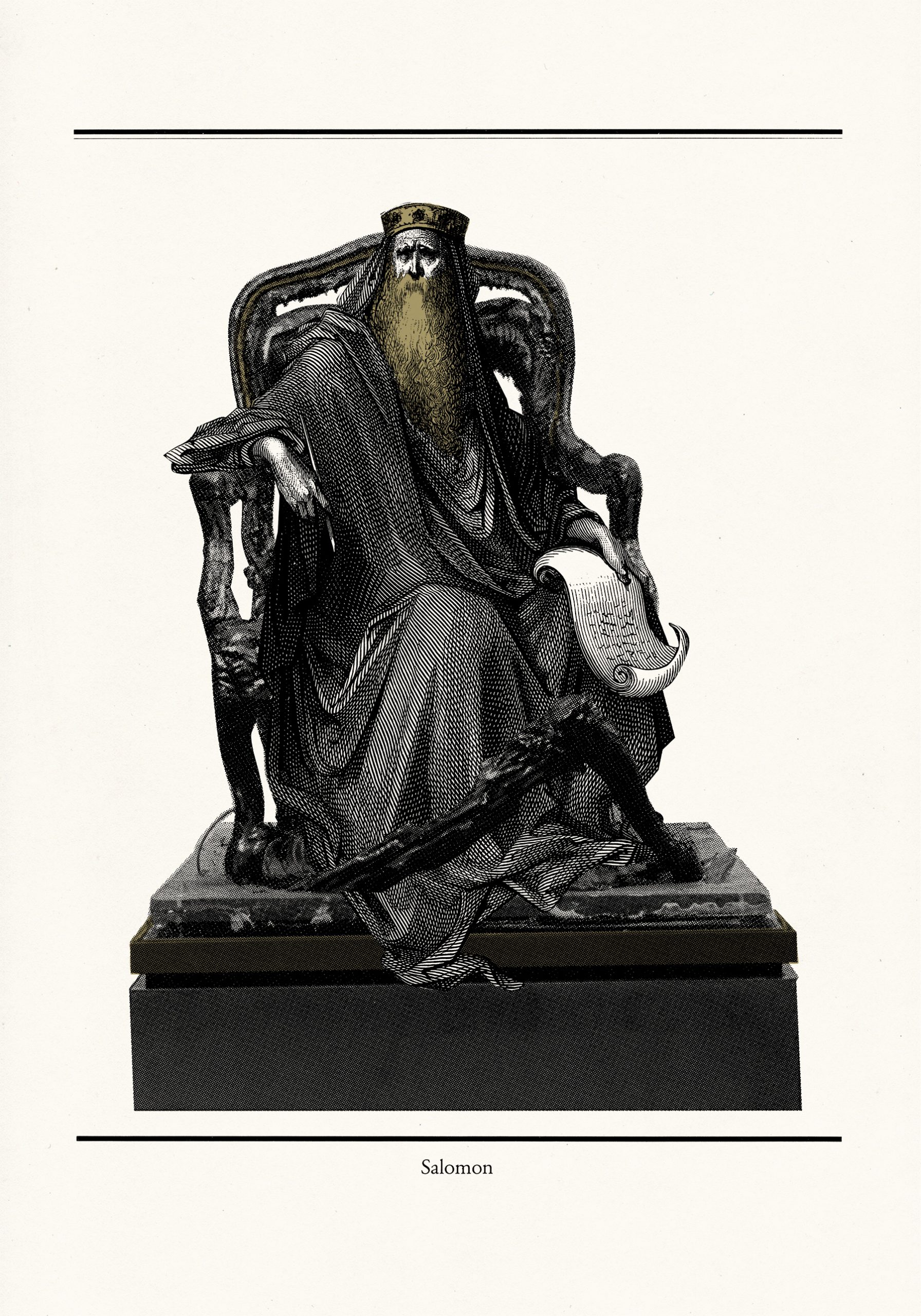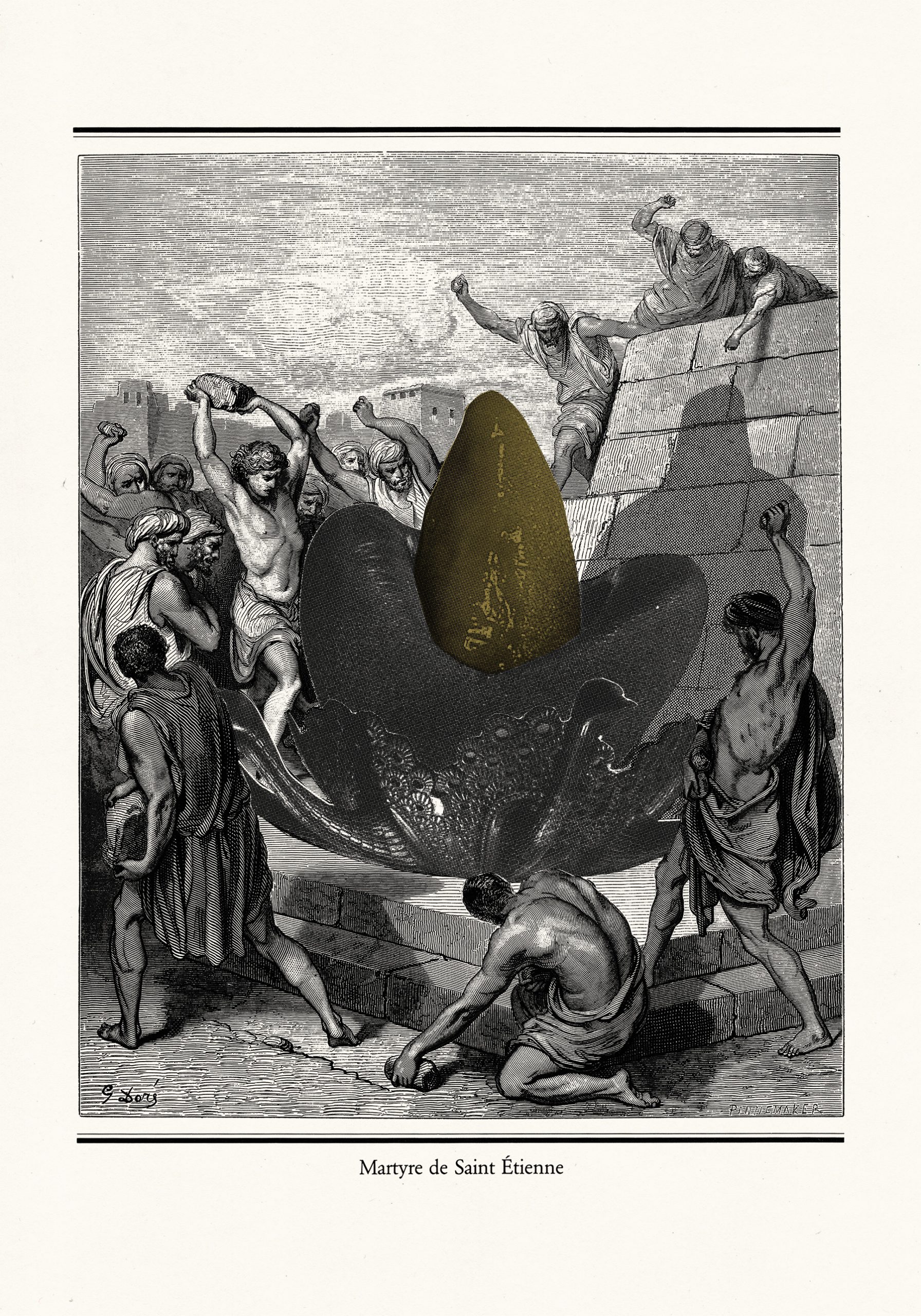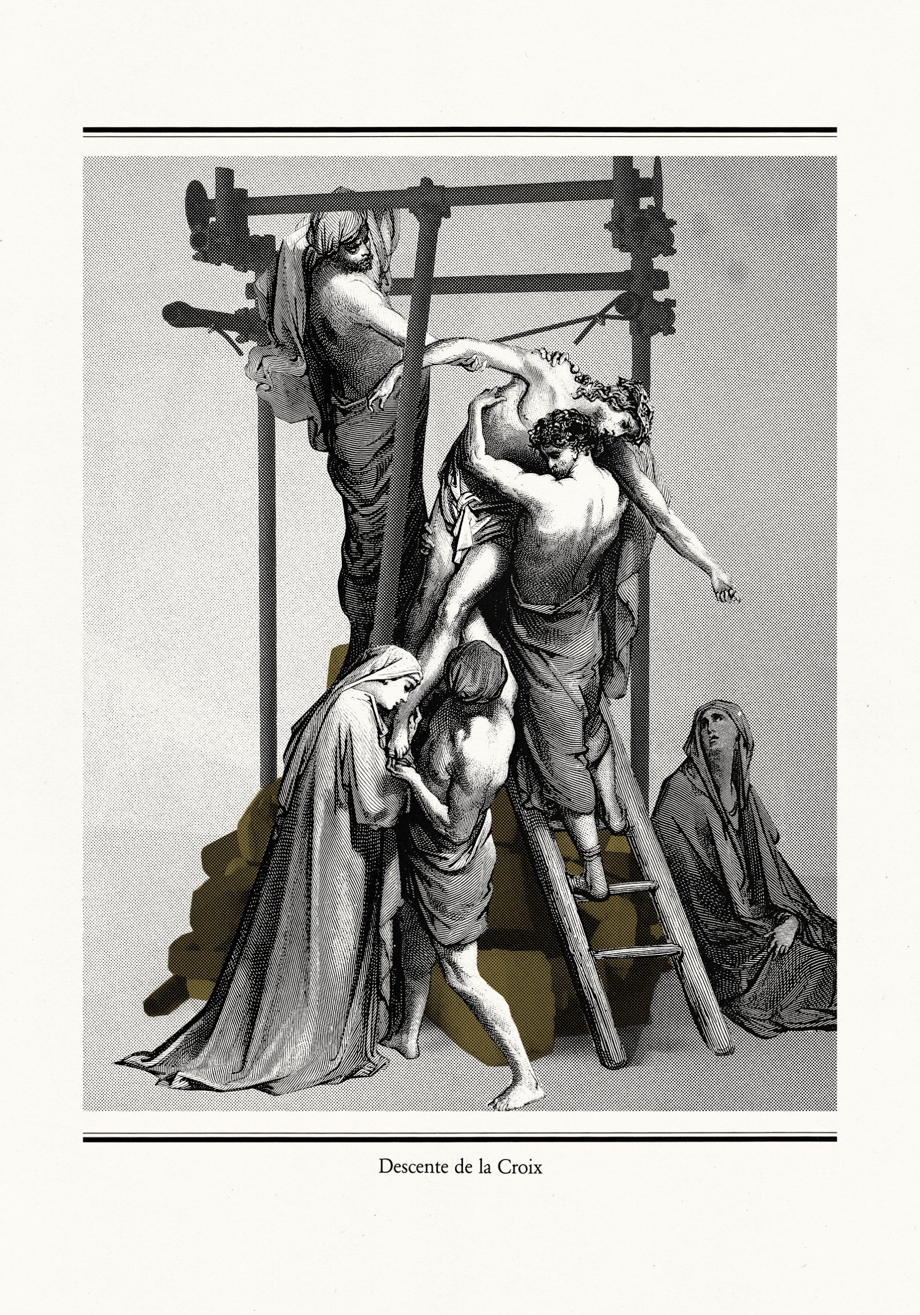 Cette série marque une évolution dans ma pratique du collage et une sorte de retour par procuration à la gravure, base de ma formation artistique. Les images d’origine proviennent de la Bible illustrée de Gustave Doré, dont sont conservées les légendes. Si l’objet final est une édition en sérigraphie imprimé en noir et doré, les images démarrent par un collage prototype sur papier, qui est ensuite retravaillé sur ordinateur afin de mieux fondre les éléments étrangers (souvent photographiques et donc en couleurs) dans les estampes d’origine.